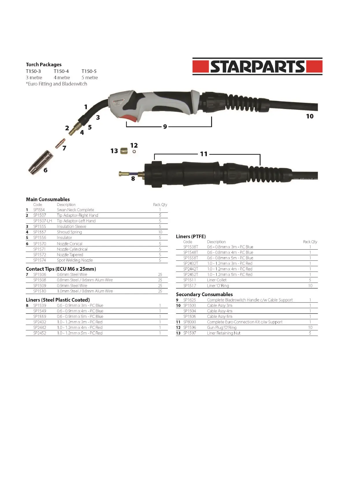 T150 Rang 230A Co2 / 200A Mixed Gases @ 60% Duty Cycle EN60974-7 Wire Size 0.8mm to 1.2mm