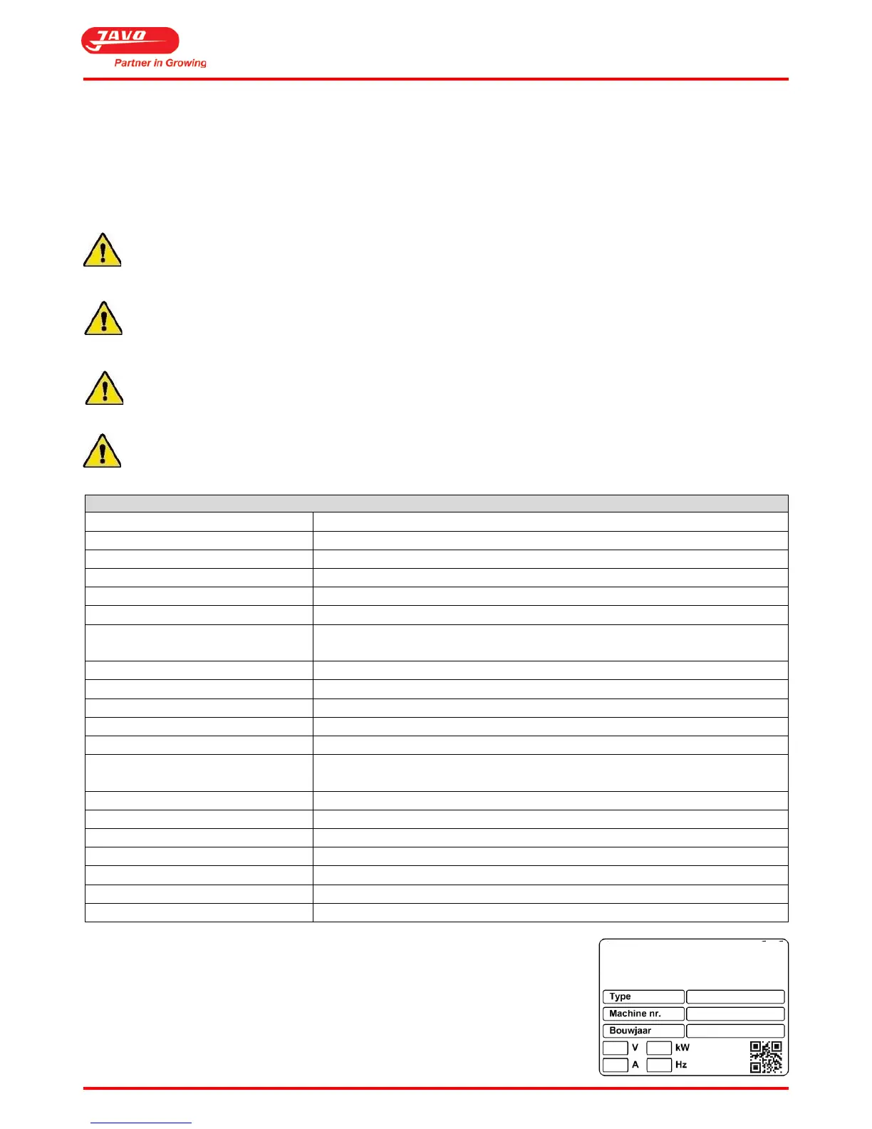assembly drawing and indicated in this manual. If the machine is used outside these specifications, Javo BV