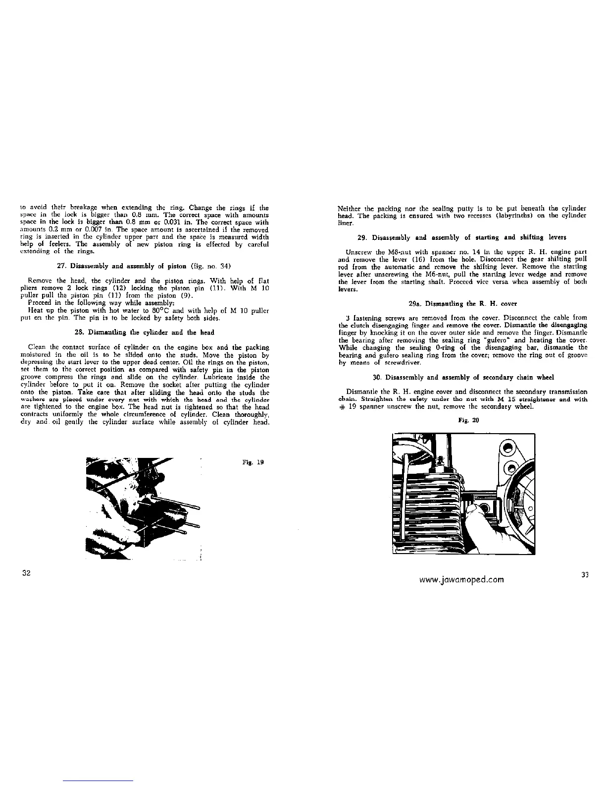 JAWA 50 21 - Disassembly and Assembly of Piston; Dismantling the Cylinder and the Head; Disassembly and Assembly of Starting and Shifting Levers; Dismantling the R. H. Cover