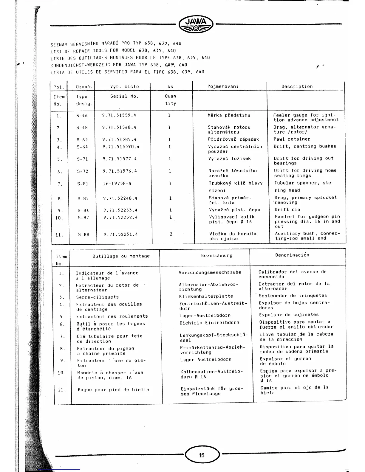 JAWA 638 - Tools and Lubricants; List of Repair Tools