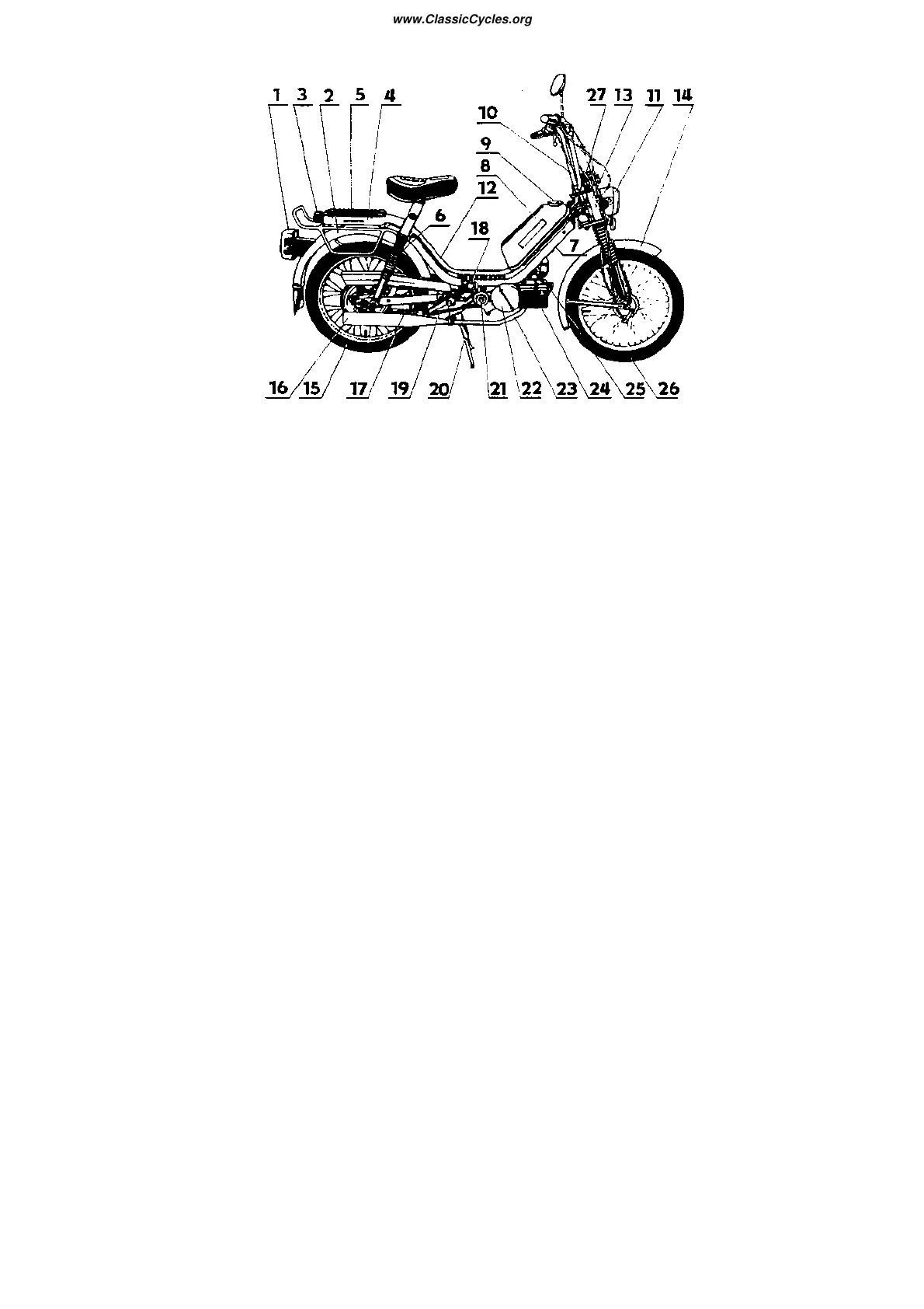 22. Alternator (under cover), 23. Exhaust pipe, 24. Engine, 25. Spark plug with cable shoe, 26. Front wheel,