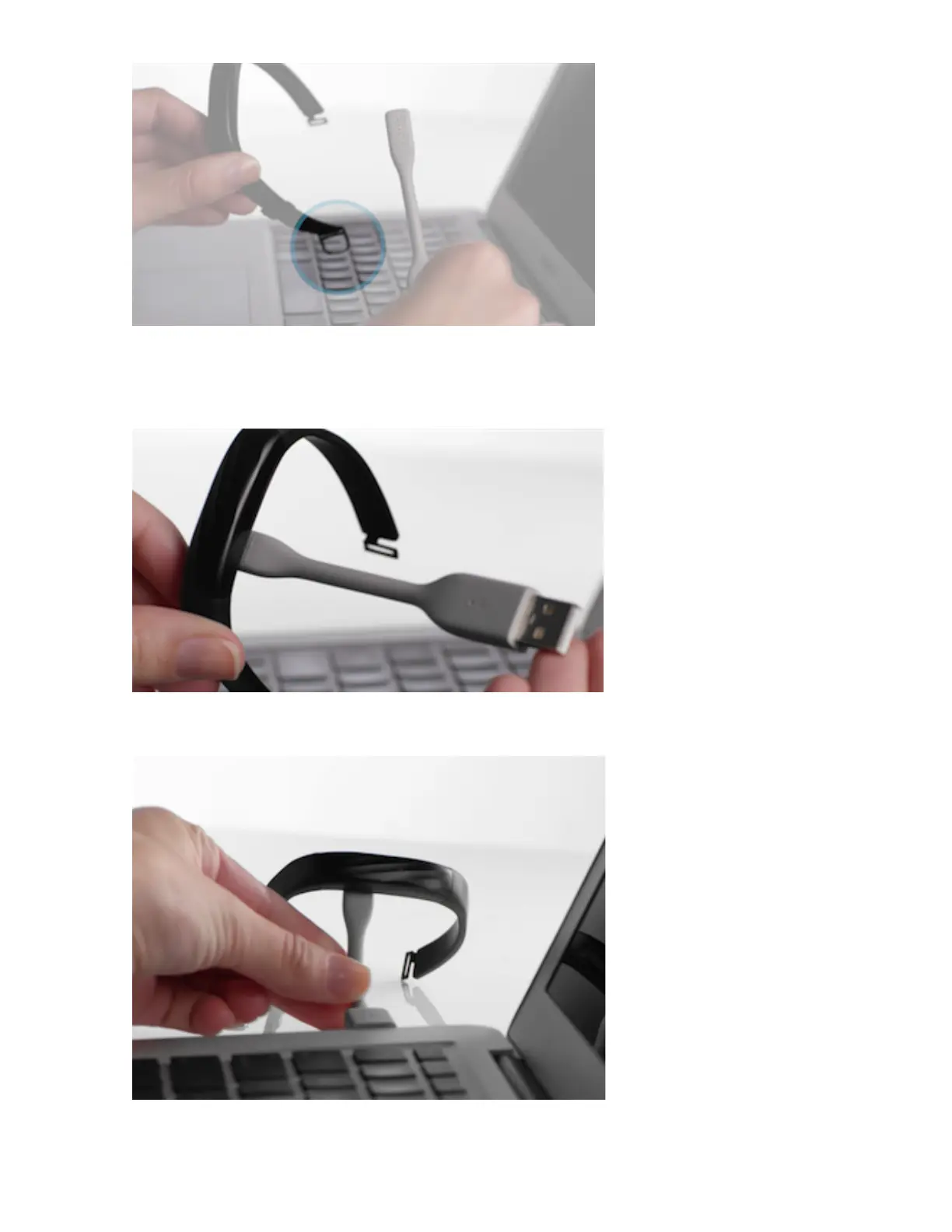Затем подключите зарядный кабель справа, совместив его контакты с разъемом на браслете.