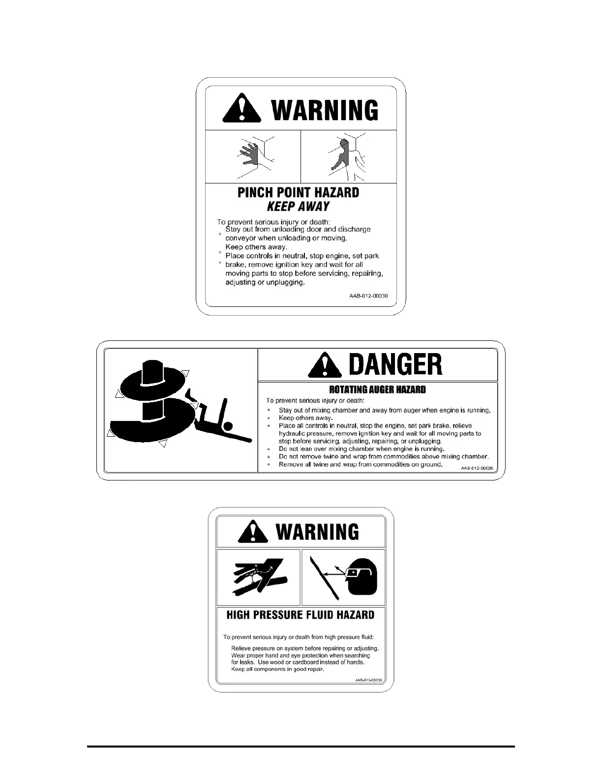 Jay-Lor A50 - Figure 5 - Pinch Point Hazard Decal; Figure 6 - Rotating Auger Hazard Decal; Figure 7 - High Pressure Fluid Hazard Decal