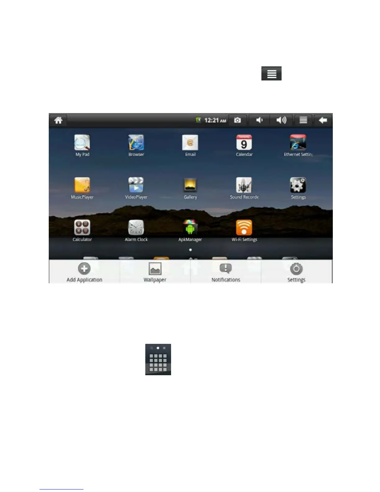 bar on the top. The menu items include: Add Application, Wallpaper,