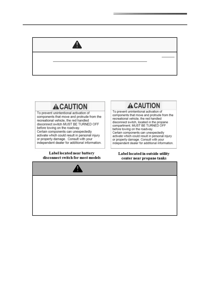 A caution label has been placed in an area near the battery disconnect switch on your RV.