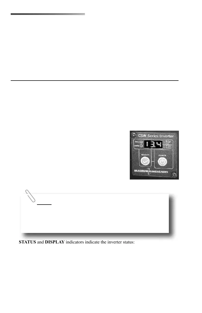 • STATUS LED AMBER, DISPLAY LED GREEN - Inverter Mode is active. In-