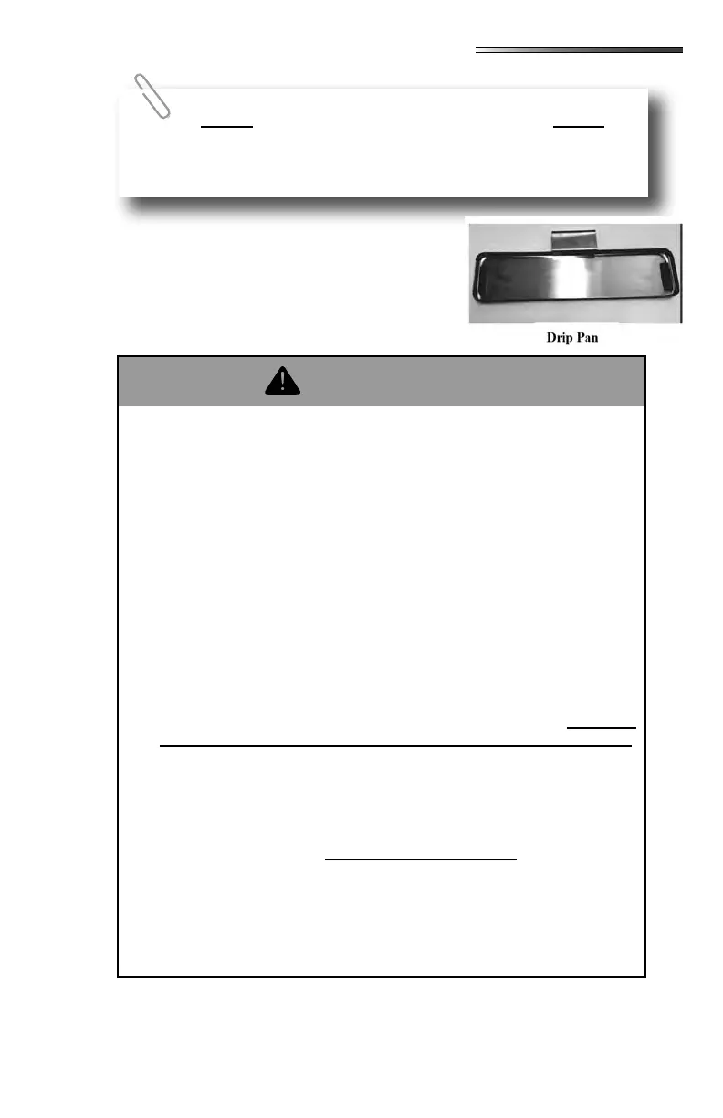 Install the drip pan under the grill to catch hot grease & liquids. Failure