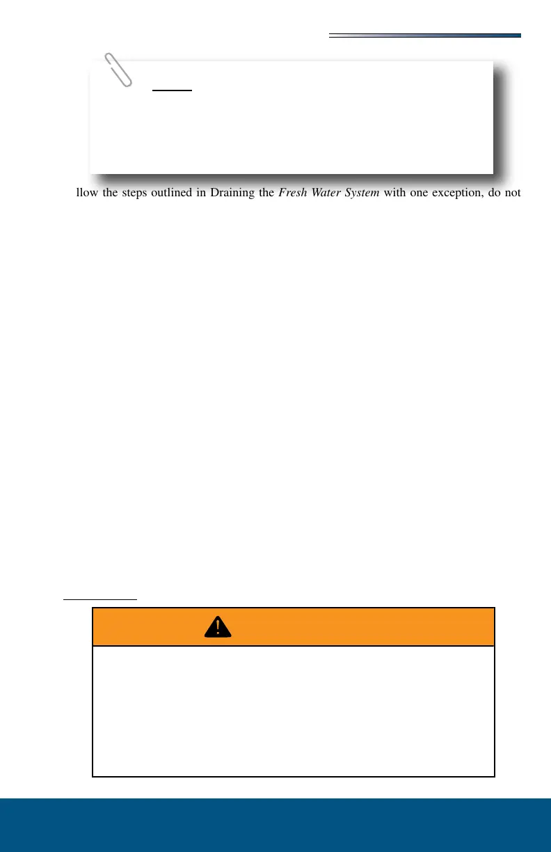 Follow the steps outlined in Draining the Fresh Water System with one exception, do not
