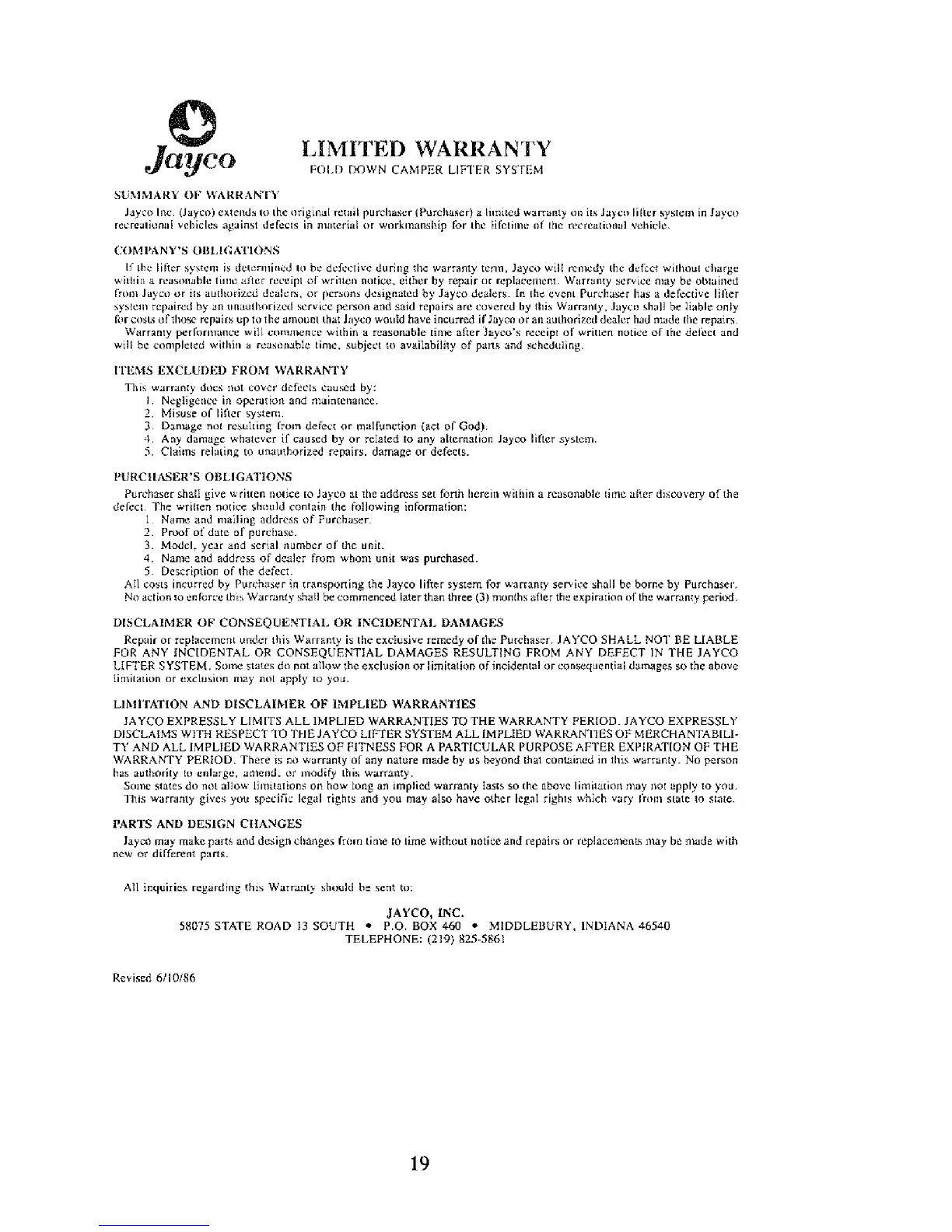 THE JAYCO LIFTER SYSTEM ALL iMPLlED WARKAN'I'IES 01: MERCHANTABILl-
