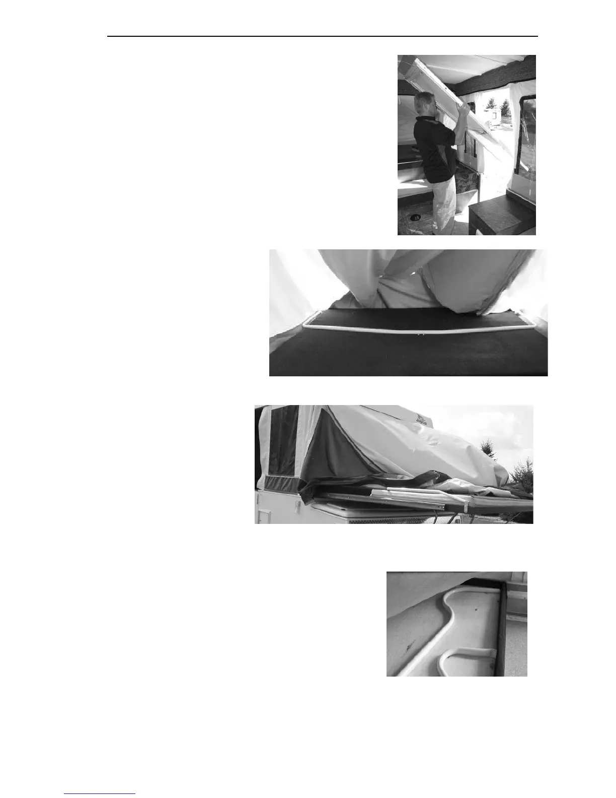 Remove the entry door from under the rear bed and place it back into traveling position on