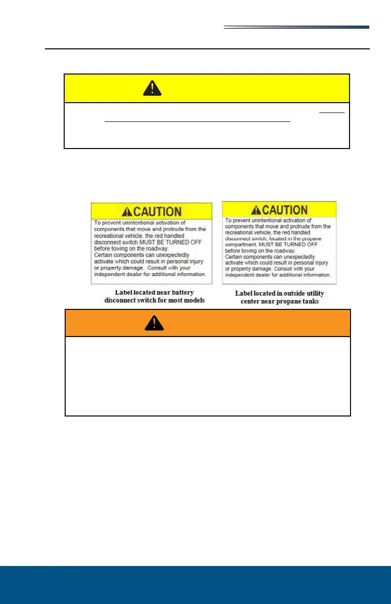 A caution label has been placed in an area near the battery disconnect switch on your RV.