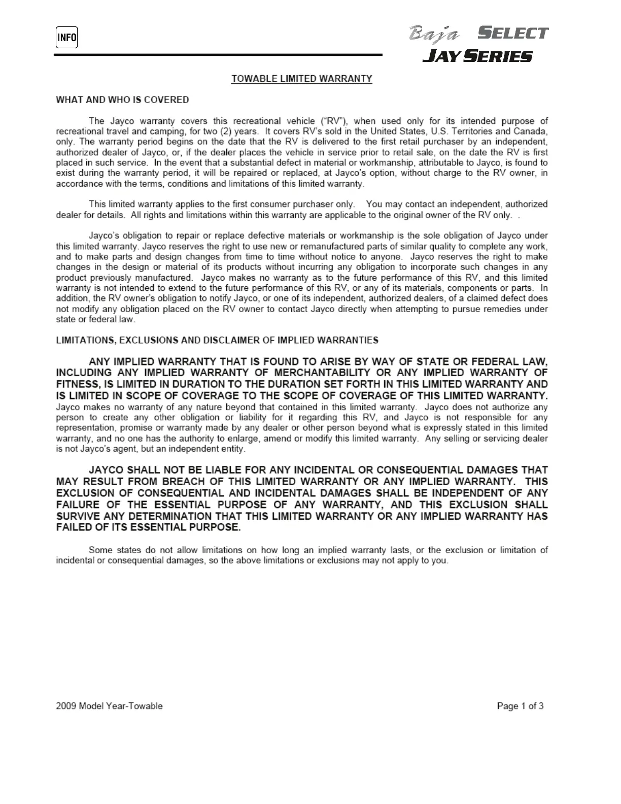 Jayco JAY SERIES - TOWABLE LIMITED WARRANTY; WHAT AND WHO IS COVERED