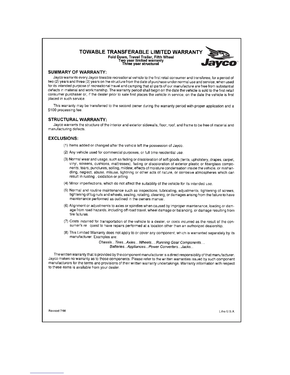TOWABLE TRANSFERABLE LIMITED WARRANTY