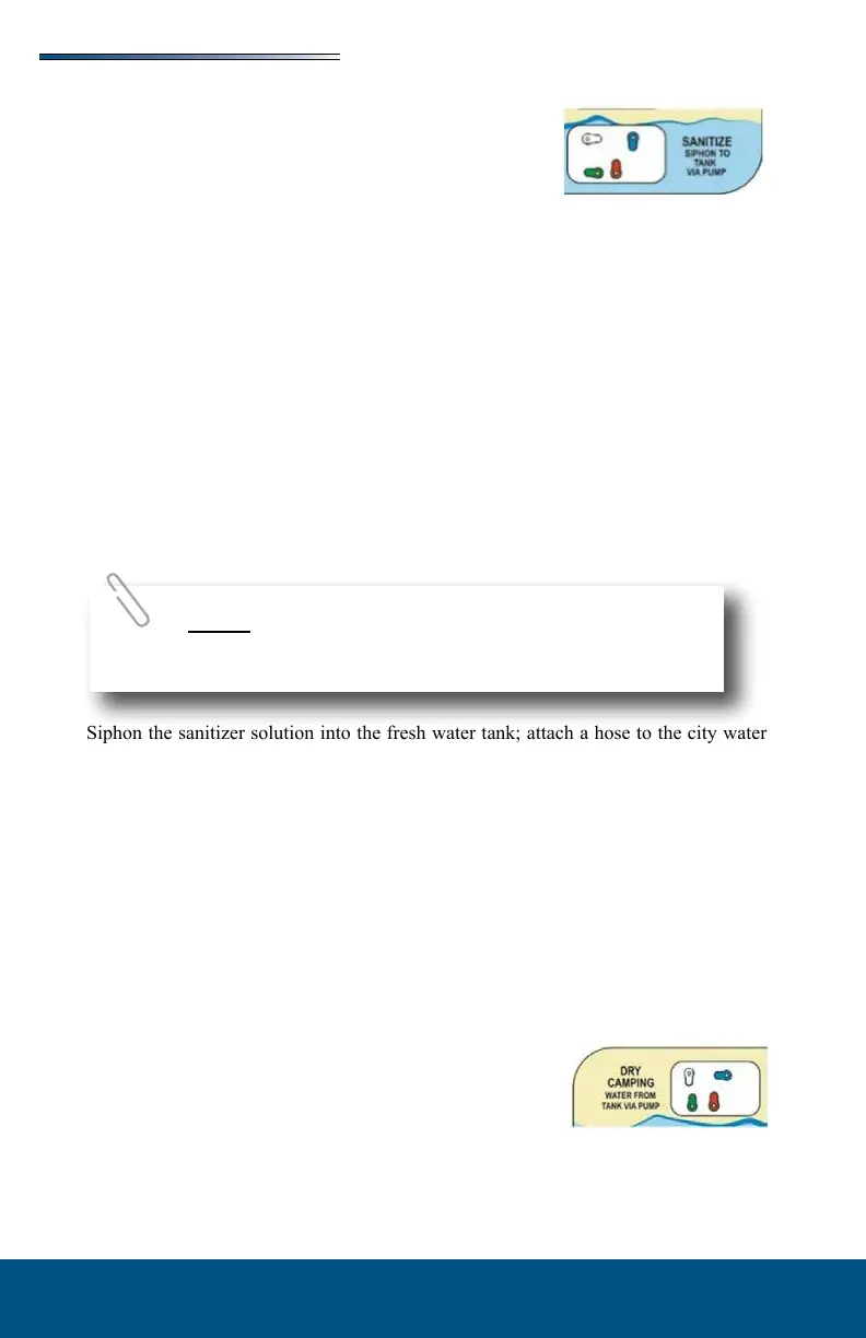 5. Siphon the sanitizer solution into the fresh water tank; attach a hose to the city water
