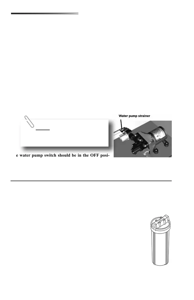 Periodically check the in-line water pump strainer for accumulated debris. To clean, shut