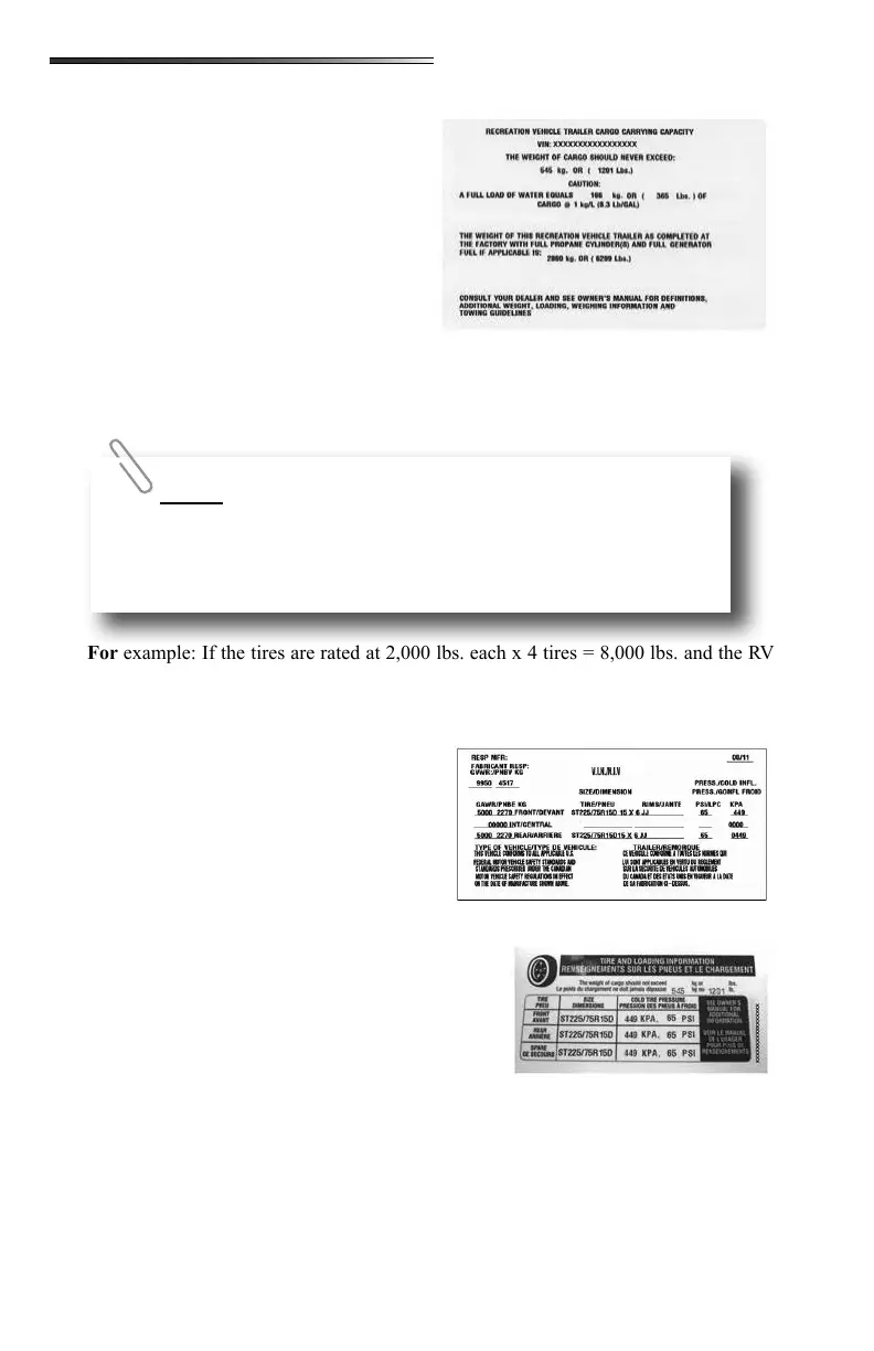 example: If the tires are rated at 2,000 lbs. each x 4 tires = 8,000 lbs. and the RV