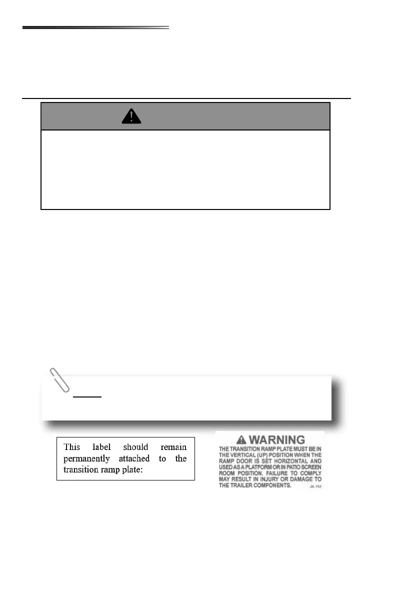 by using the tongue jack to raise the front of the trailer. To prevent damage to the ramp