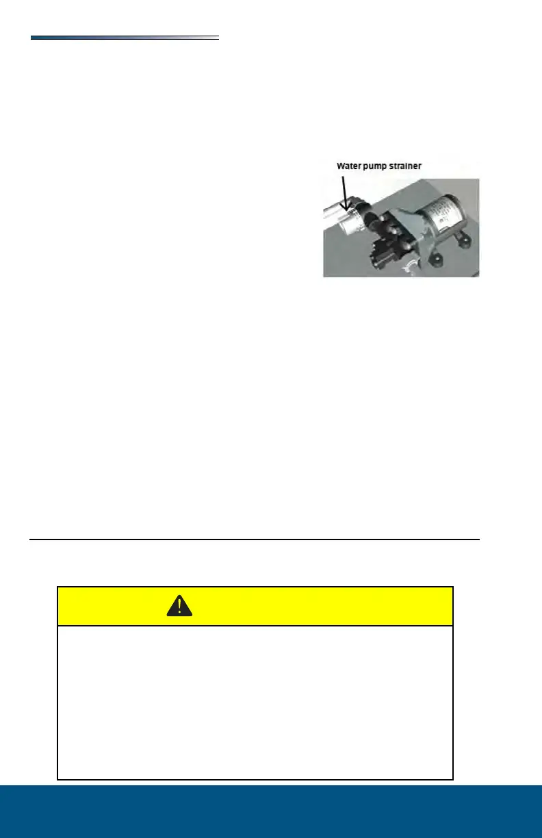 Periodically check the in-line water pump strainer for accumulated debris. To clean, shut