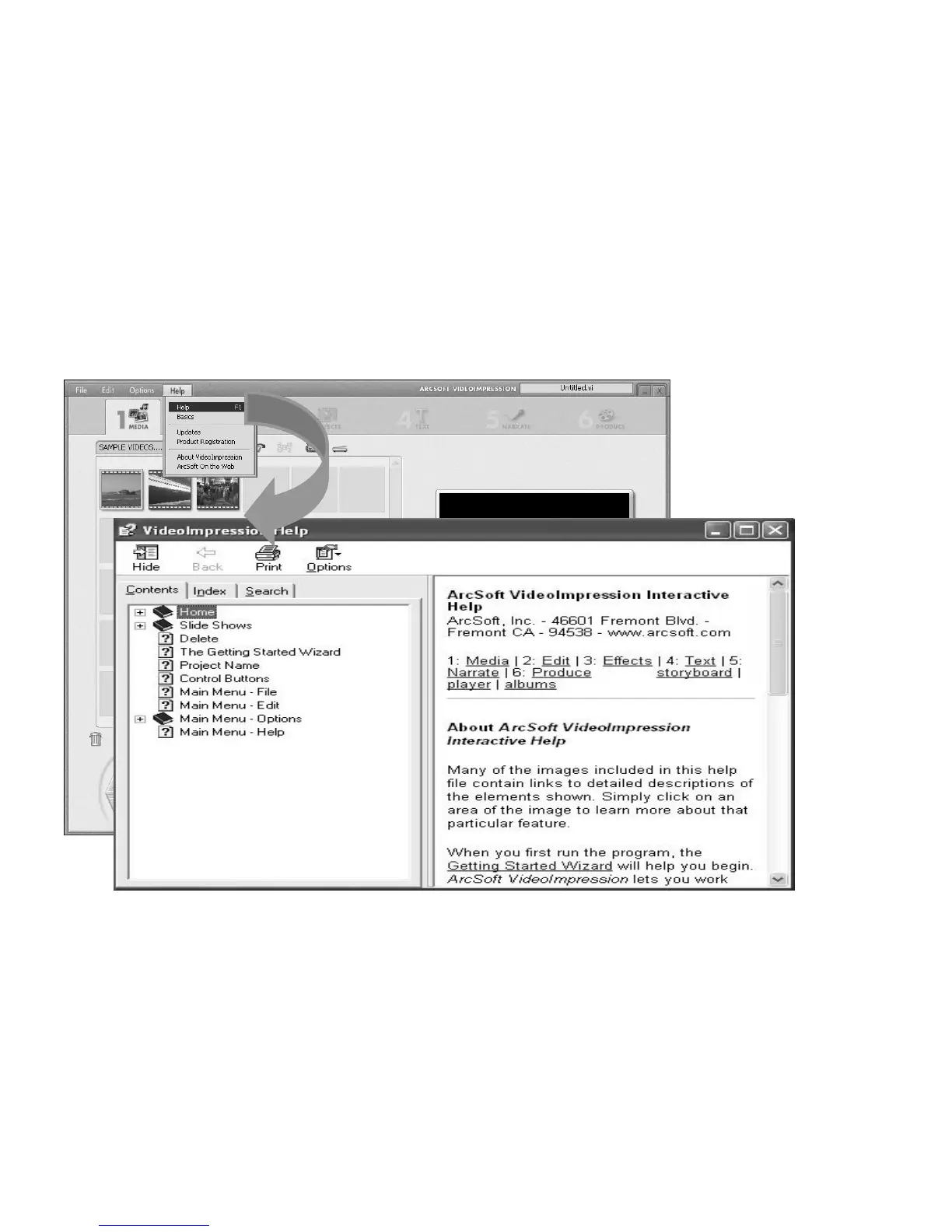 Refer to "Help" section of the program for detailed information of VideoImpression 2, see the following screen