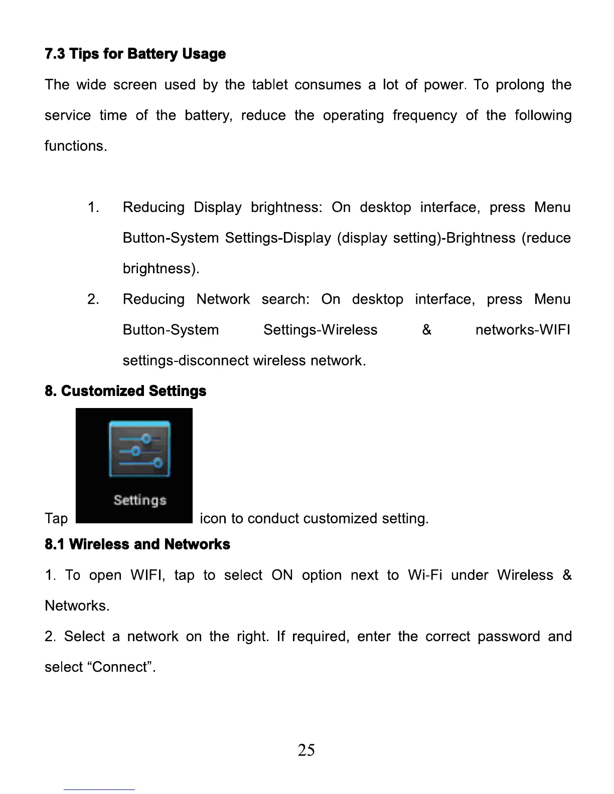 Jazz ULTRATAB C855 - Settings and Battery Management; Battery Usage Tips; Customized Settings Overview; Wireless and Network Setup
