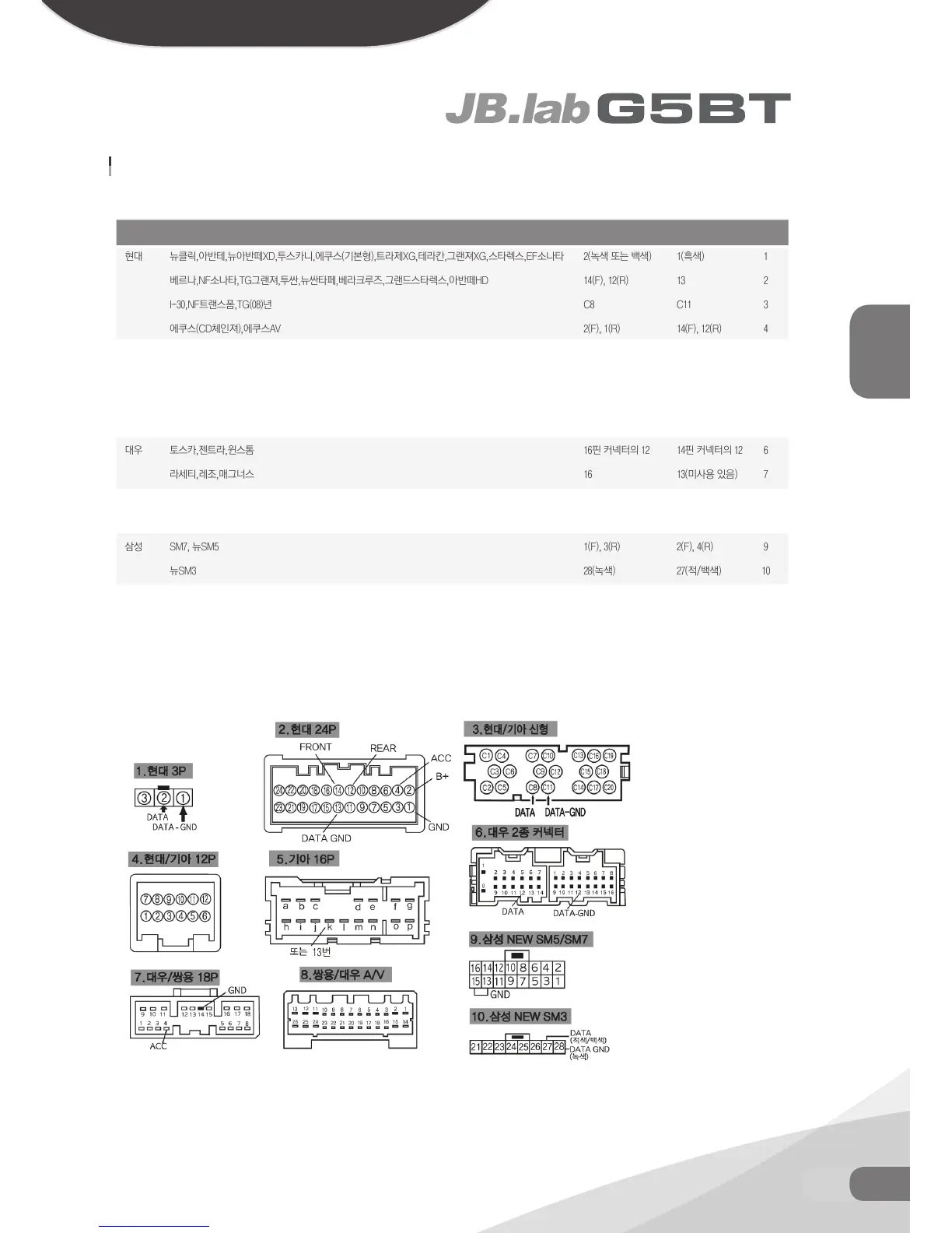 1. 아래 도표에서 차량명에 맞는 DATA 핀 번호와 DATA GND(그라운드)핀 번호를 확인합니다.