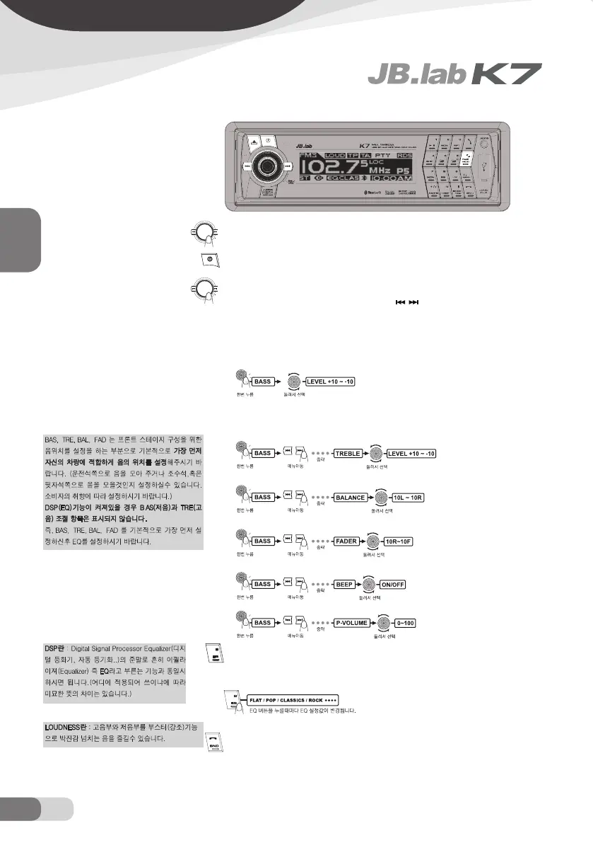 음향조절 : 음량 조절 노브를 누를 때 마다 음량, 저음, 고음, 좌우 음향, 전후음향, 비프음, 초기음량을 조