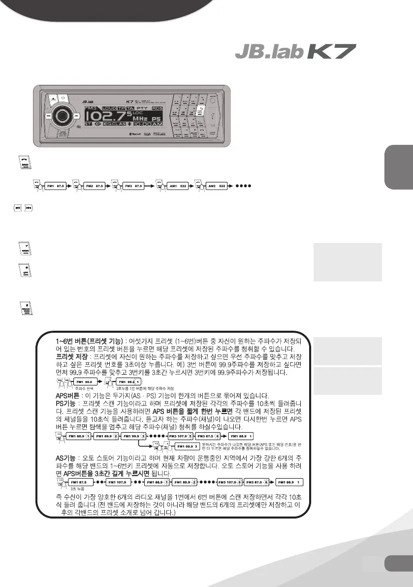 뜨며, FM 주파수를 0.1 스텝 간격으로 수동 탐색을 하실 수 있습니다. 수동 탐색 모드에서 약 5초 가량 버튼을 누르지 않으면 화면