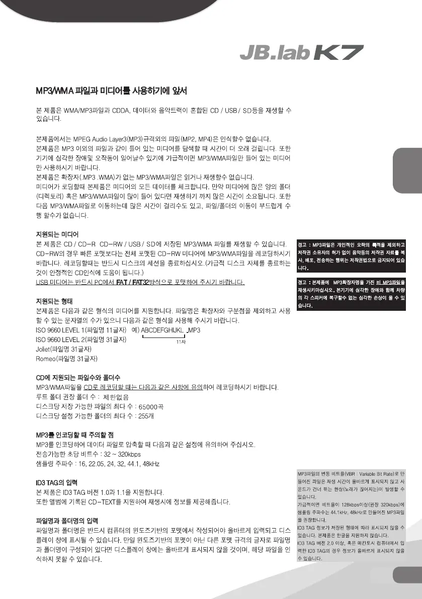 JB.lab K7 - Mp3;Wma작동법; 인코딩시 주의할 점; 지원가능 미디어, 포멧, 폴더, 파일수