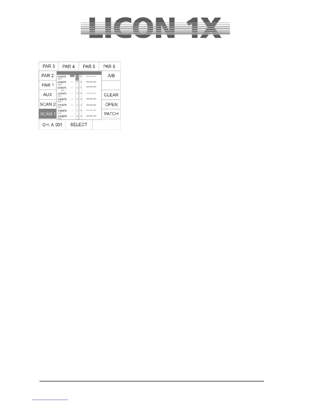 SCAN 1: enters DMX addresses for fixture no. 1 – 16