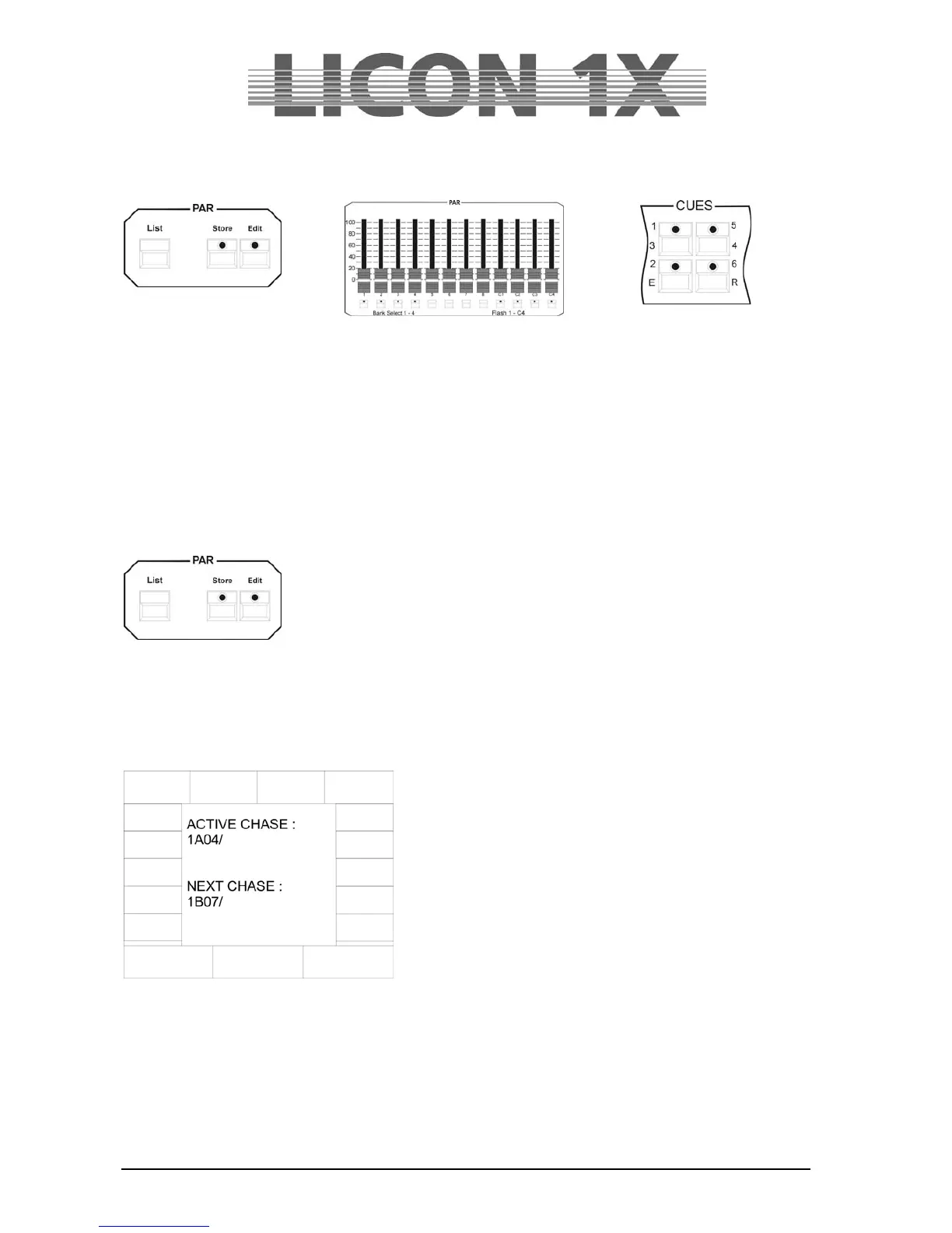 Zum Aufrufen der insgesamt 96 speicherbaren Chases im PAR-Bereich, müssen die PAR-Fader (C1-C4)