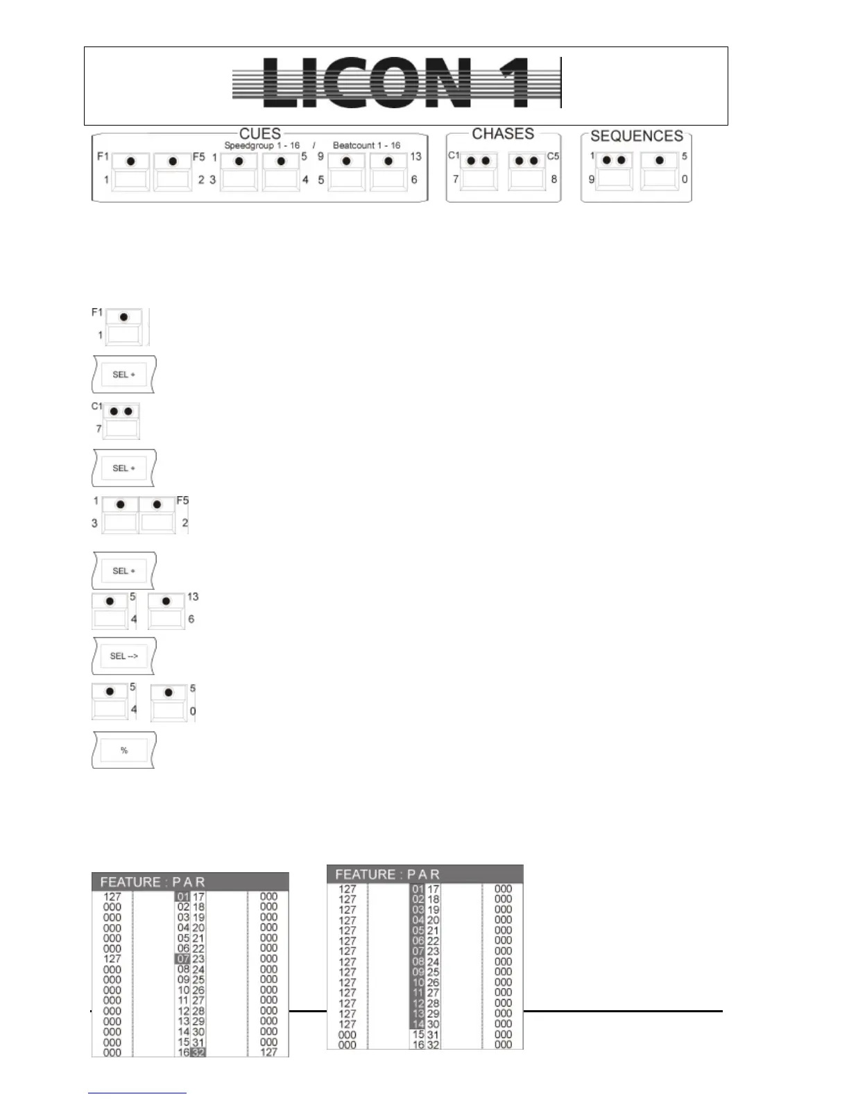 The desired block should consist from the channels number: 1, 7 and 32 to 46 with a DMX value of 50%