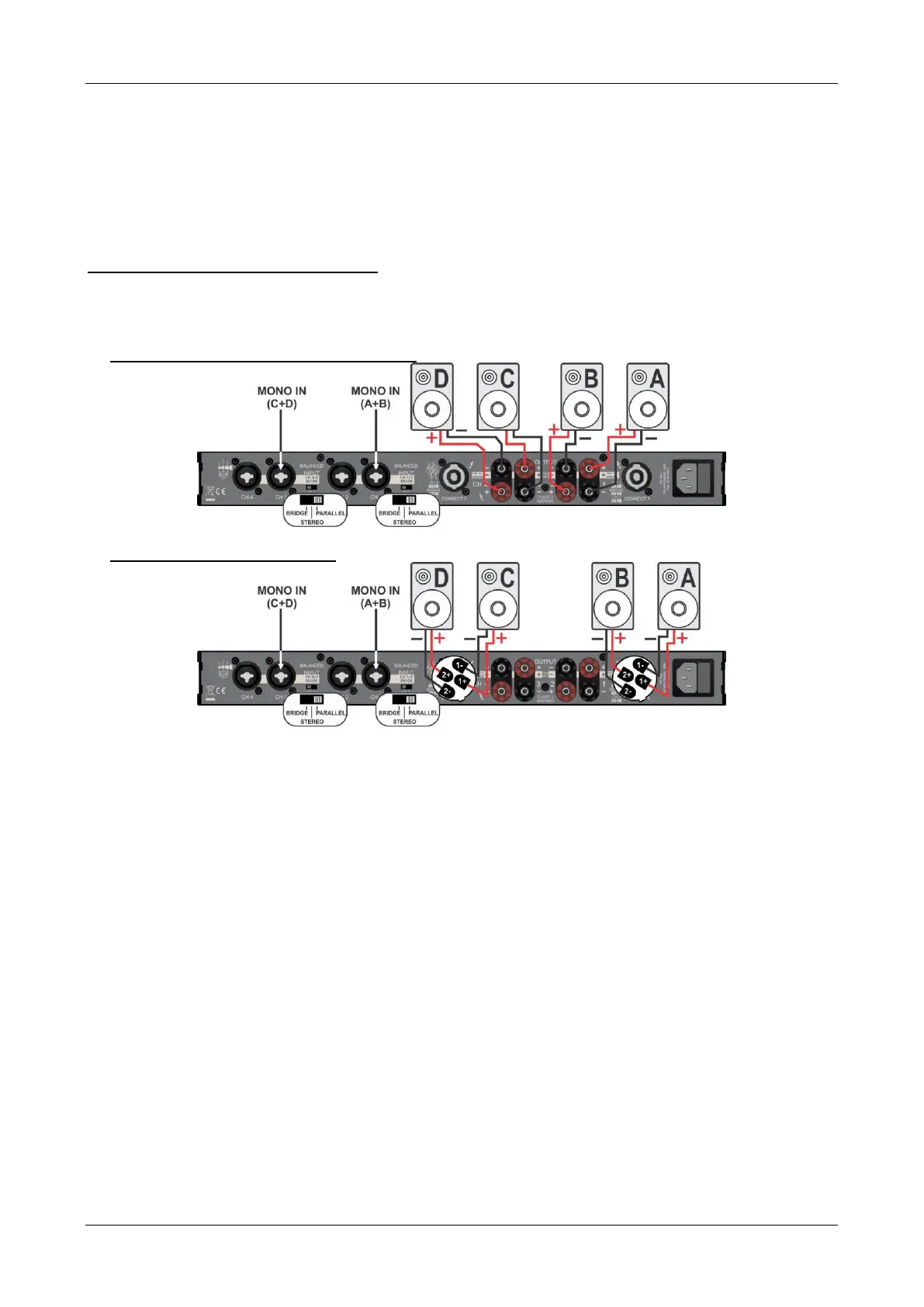 1+2 (13/14) y la entrada monoaural 3 (17) las salidas 3+4 (19/20): 4x 80 Wrms @ 8 Ω ~ 4x 150 Wrms @ 4