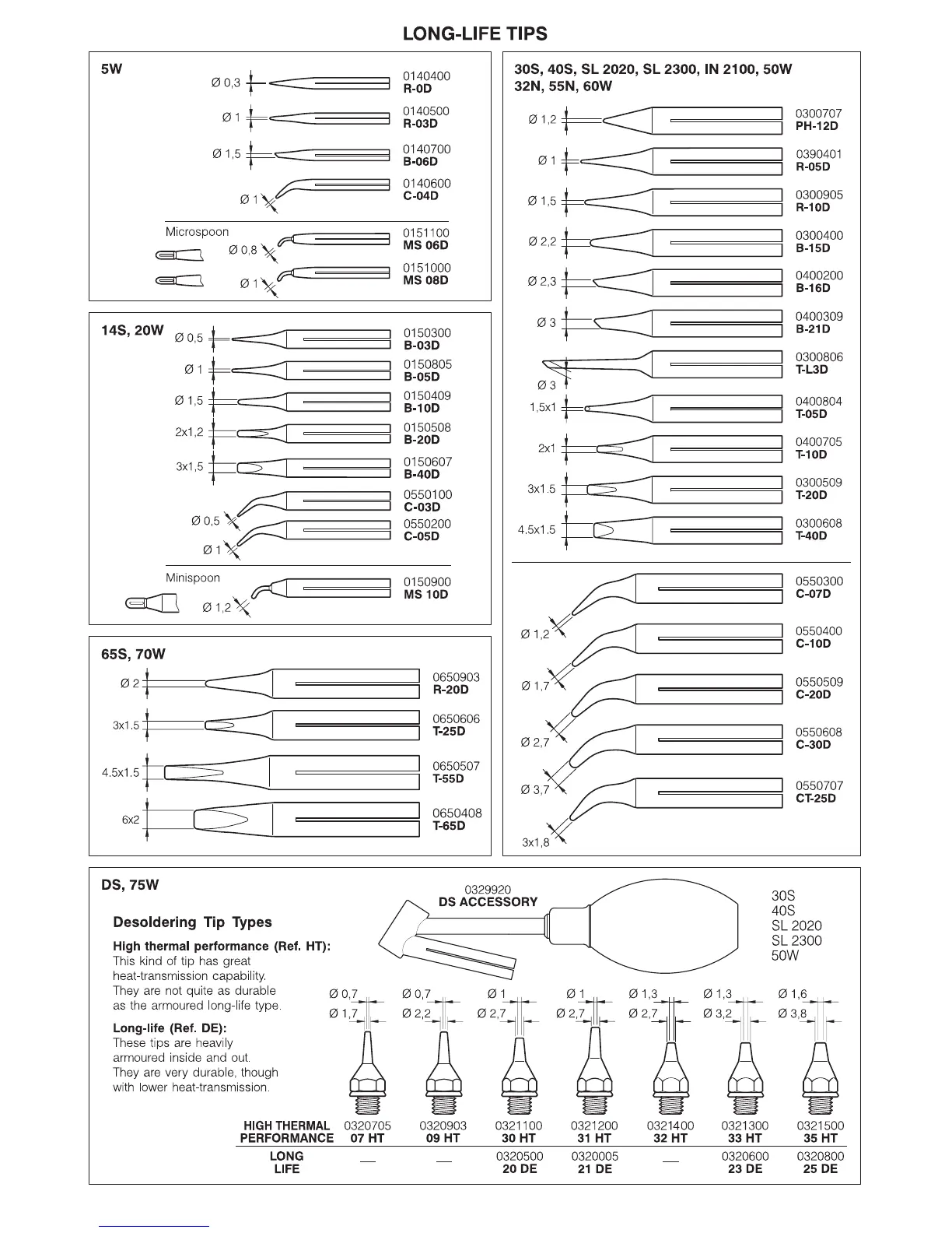 jbc MD 3050 - Long-Life Tips; Tip Types and Specifications