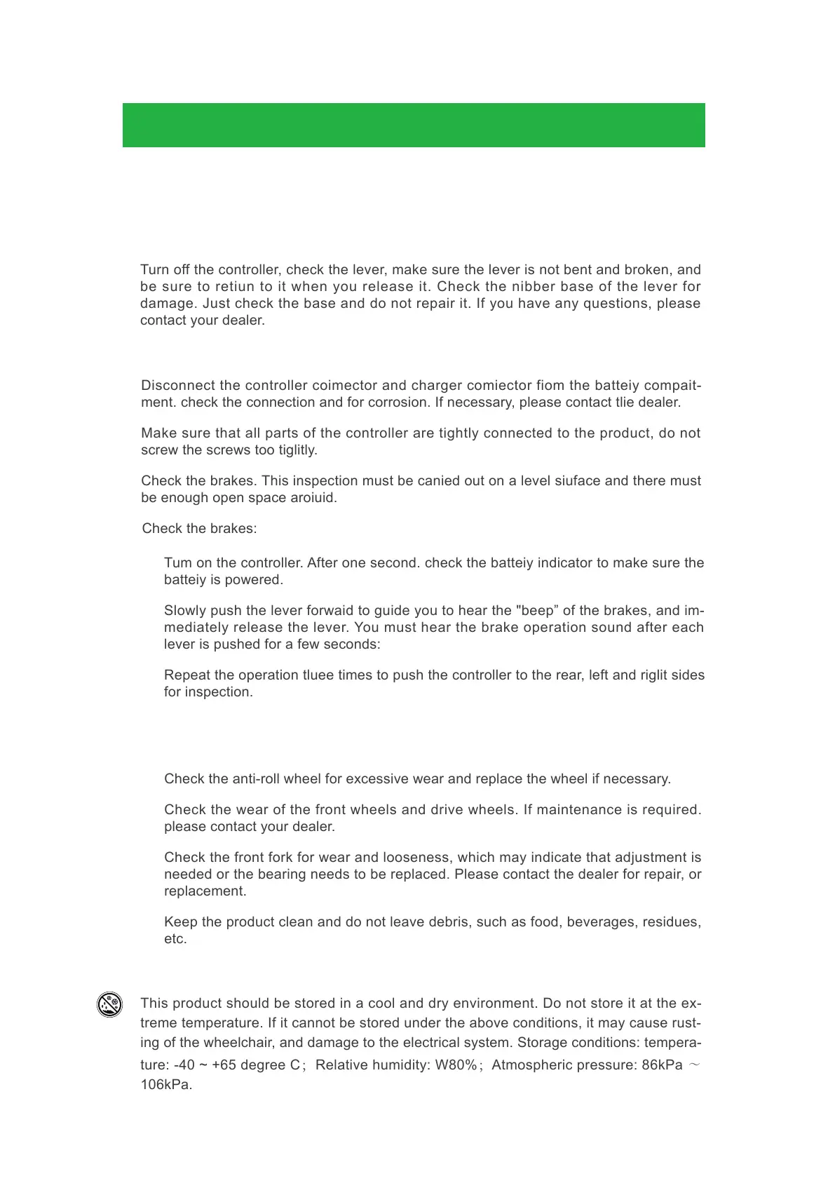 ing of the wheelchair, and damage to the electrical system. Storage conditions: tempera-