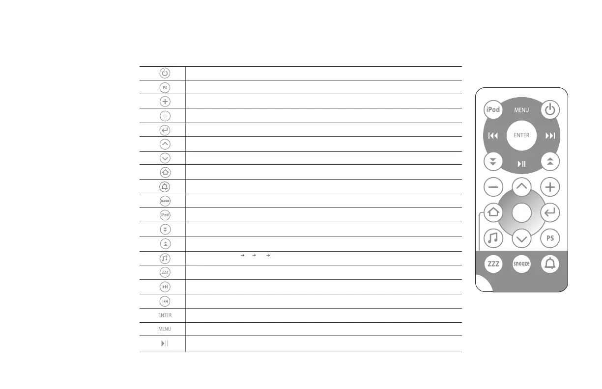 (hours and minutes) and Snooze Timer. In radio mode, manually increases tuning frequency; hold for Seek.