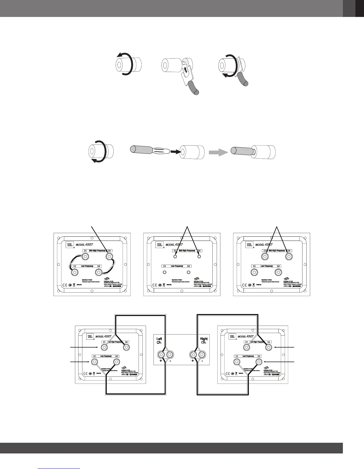 이 배열을 통해 단일 스테레오 파워 앰프 또는 스테레오 파워 앰프 2개를 사용하여 스피커를 이중 배선할 수 있습니다.