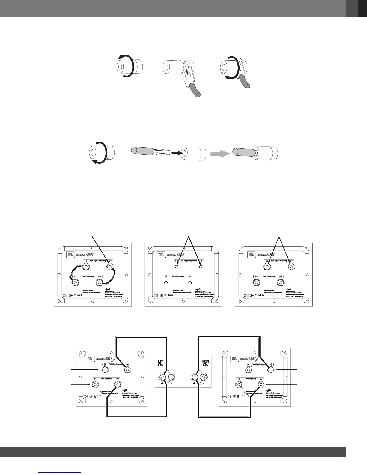 若您使用单个立体声功放进行双线分音,请按下图所示连接扬声器。