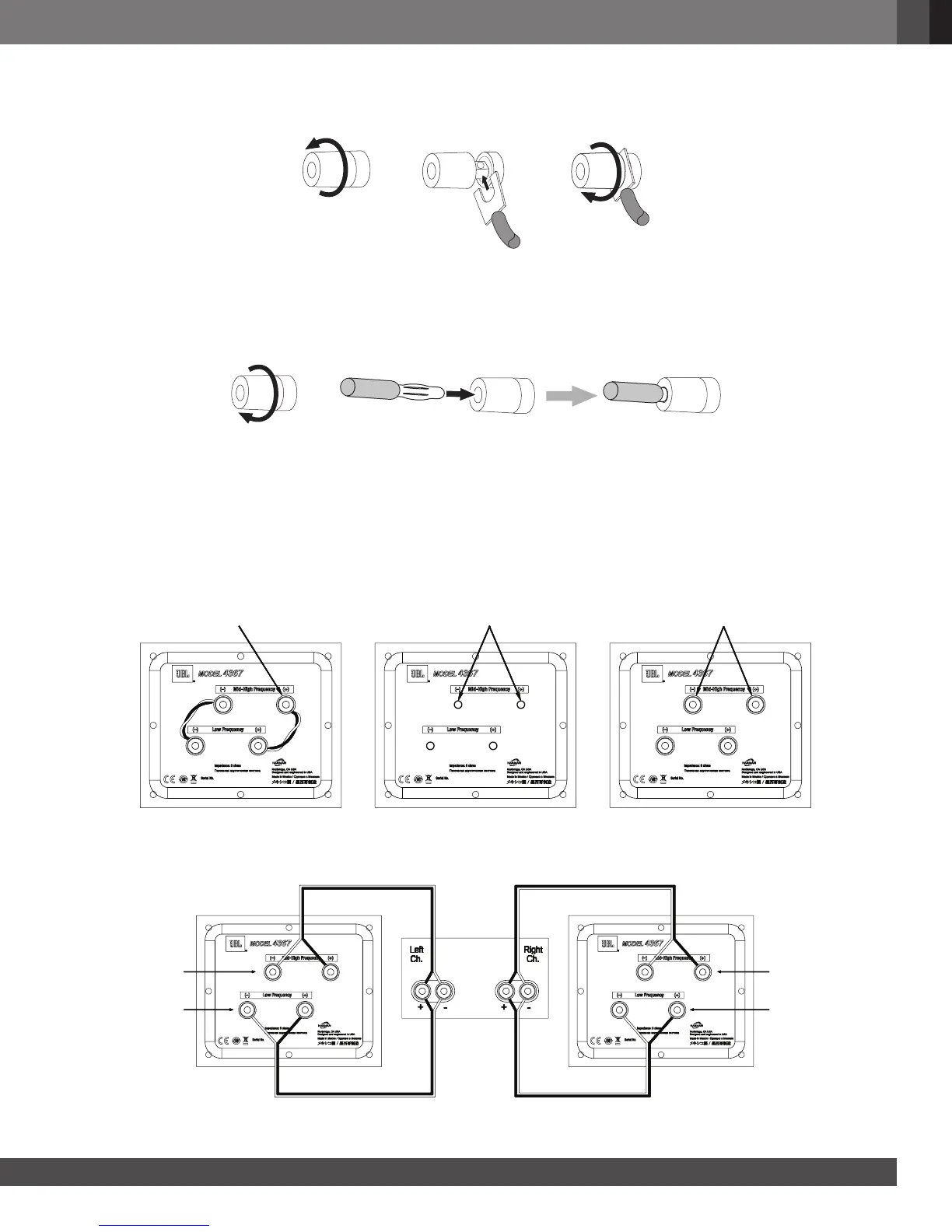 Se conectar a caixa a um amplificador de potência estéreo usando dois fios, ligue-as de acordo com a ilustração abaixo.