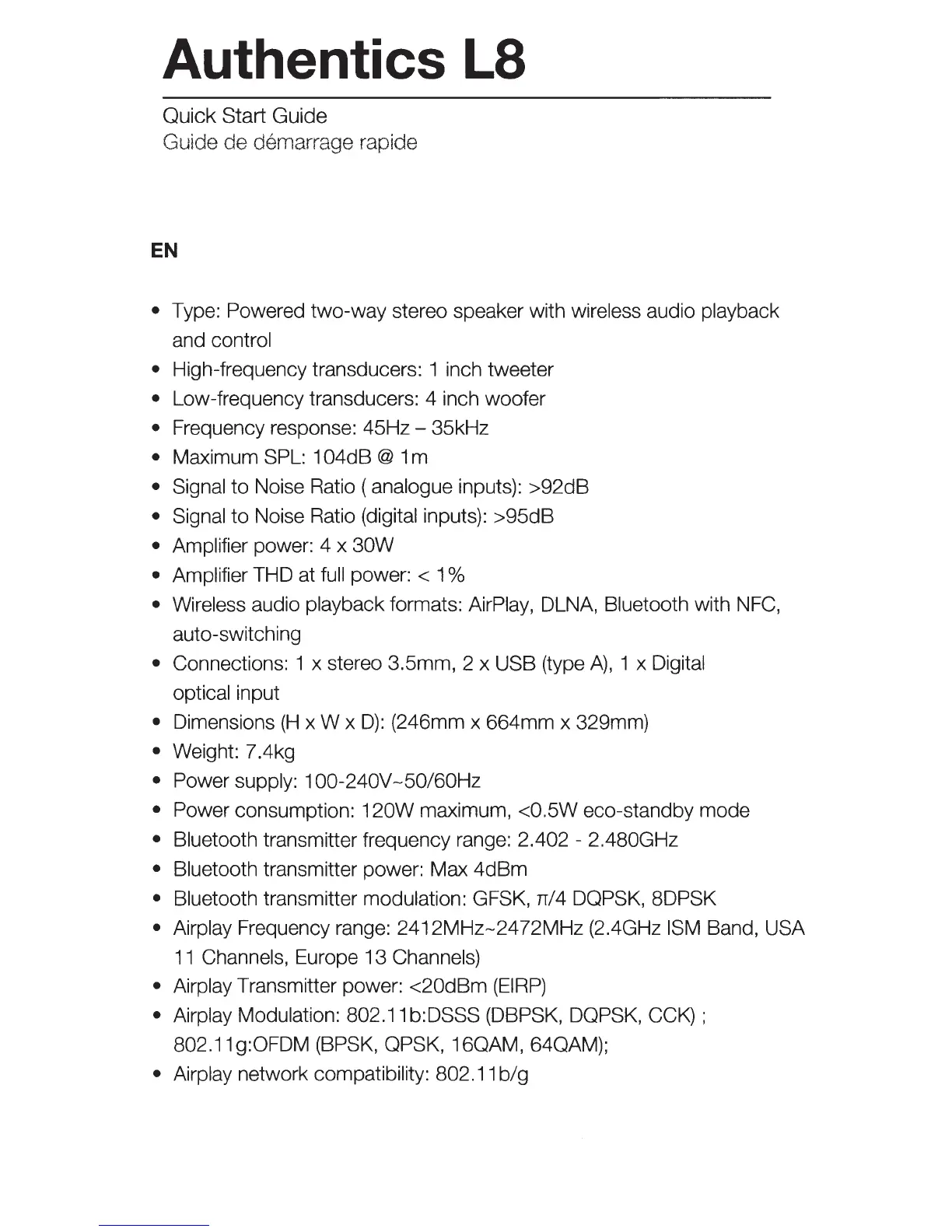 • Wireless audio playback formats: AirPlay, DLNA, Bluetooth with