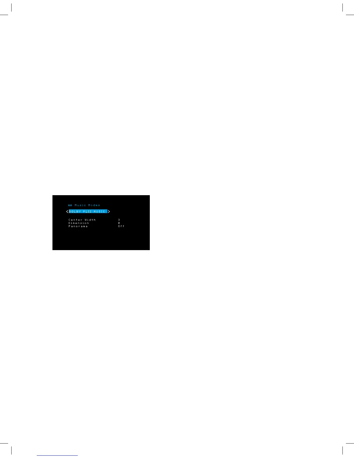 • Music: Logic 7 Music, DTS Neo:6 Music, Dolby Pro Logic II Music.