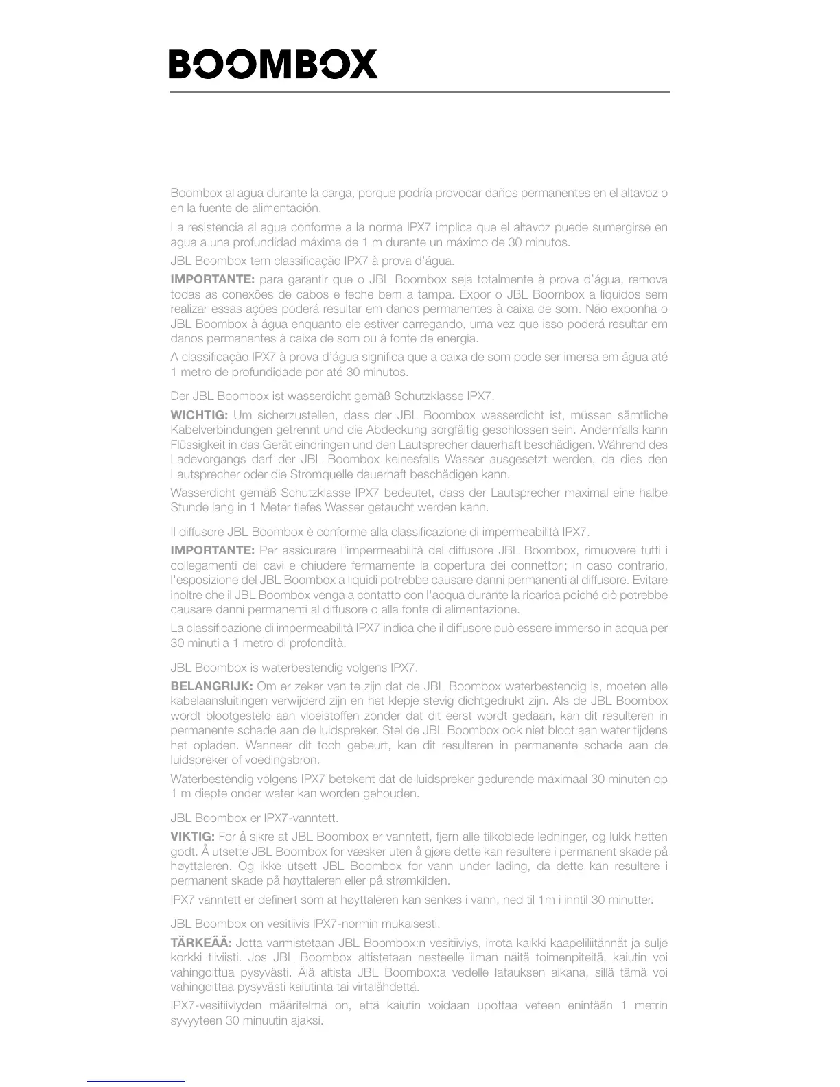 korkki tiiviisti. Jos JBL Boombox altistetaan nesteelle ilman näitä toimenpiteitä, kaiutin voi
