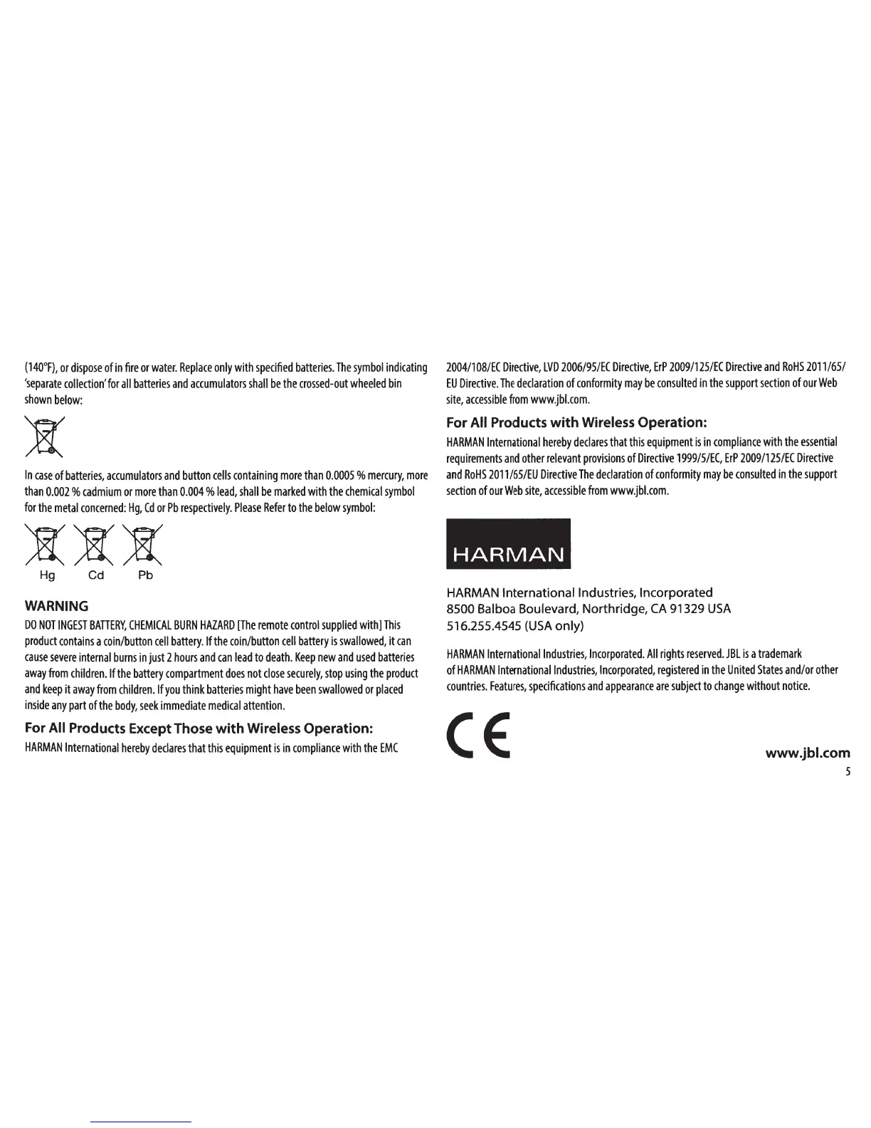JBL Charge 2 - Critical Battery Warnings; Battery Ingestion Hazard; Product Compliance Declarations; Manufacturer Information