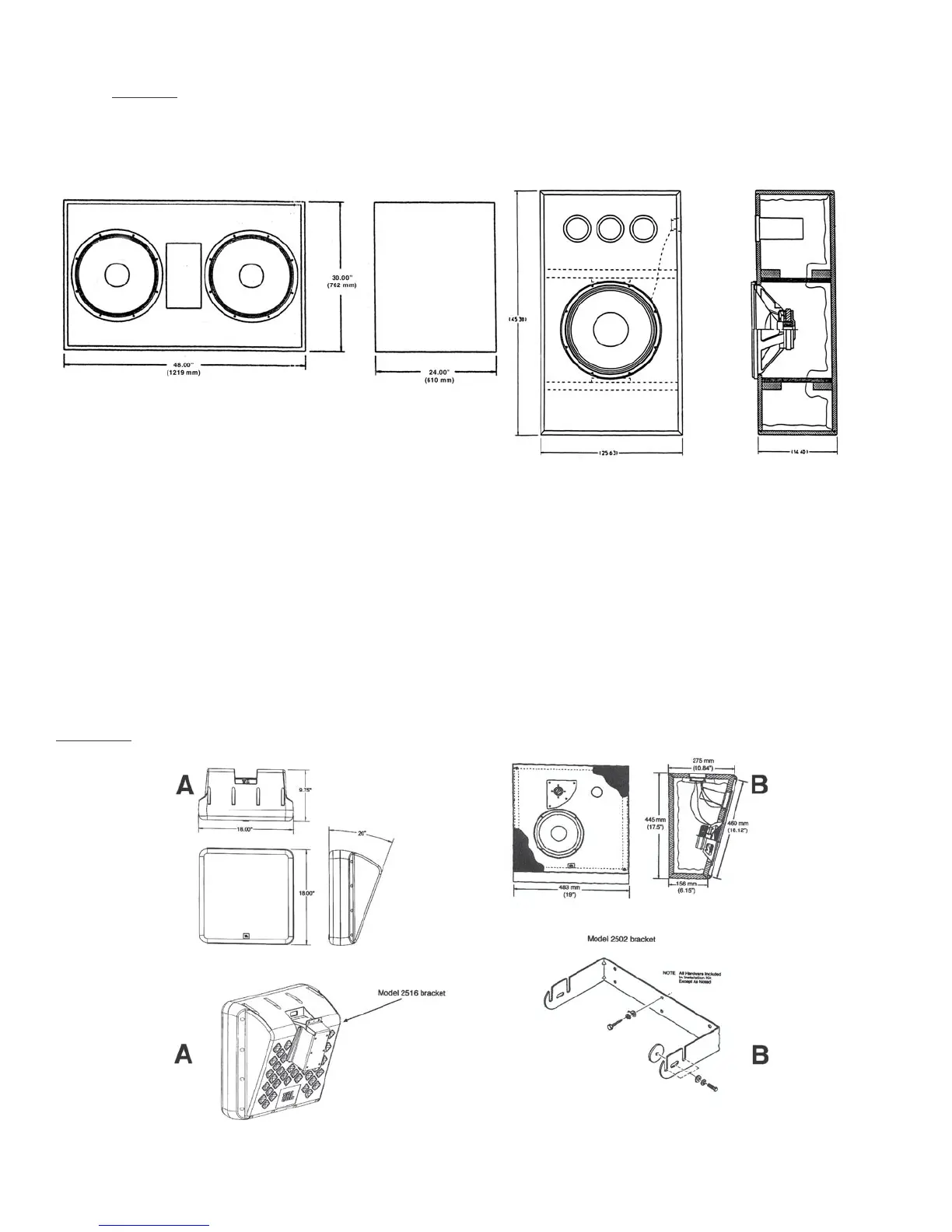 Figure 25A: Front and side drawings of JBL surround loudspeakers. 8330A and 8340A (A); 3310 and 2502 bracket (B).