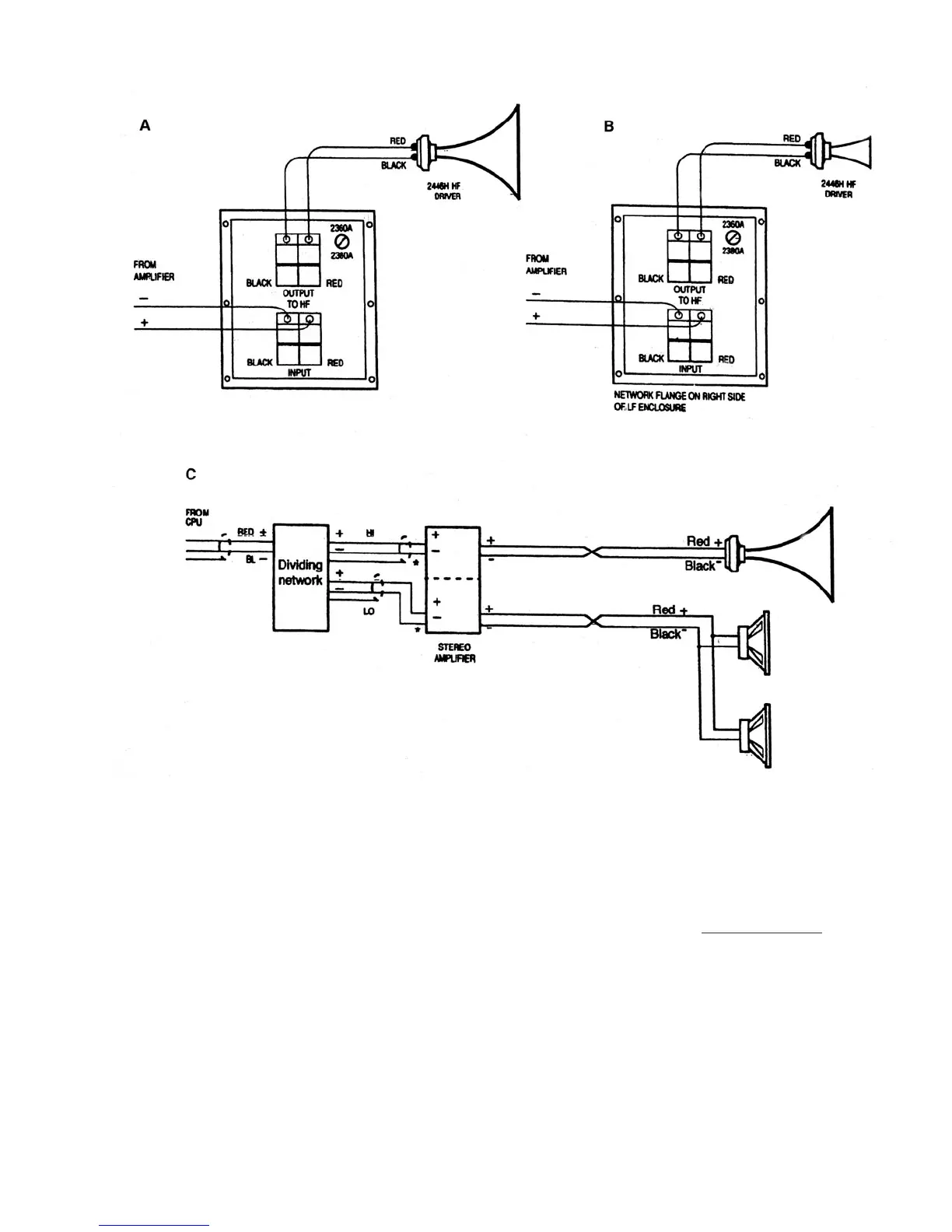 Figure 34: Wiring diagram for 4000 Series. Passive network operation of 4675C (A) and 4670D (B); biamped operation of 4675C (C).