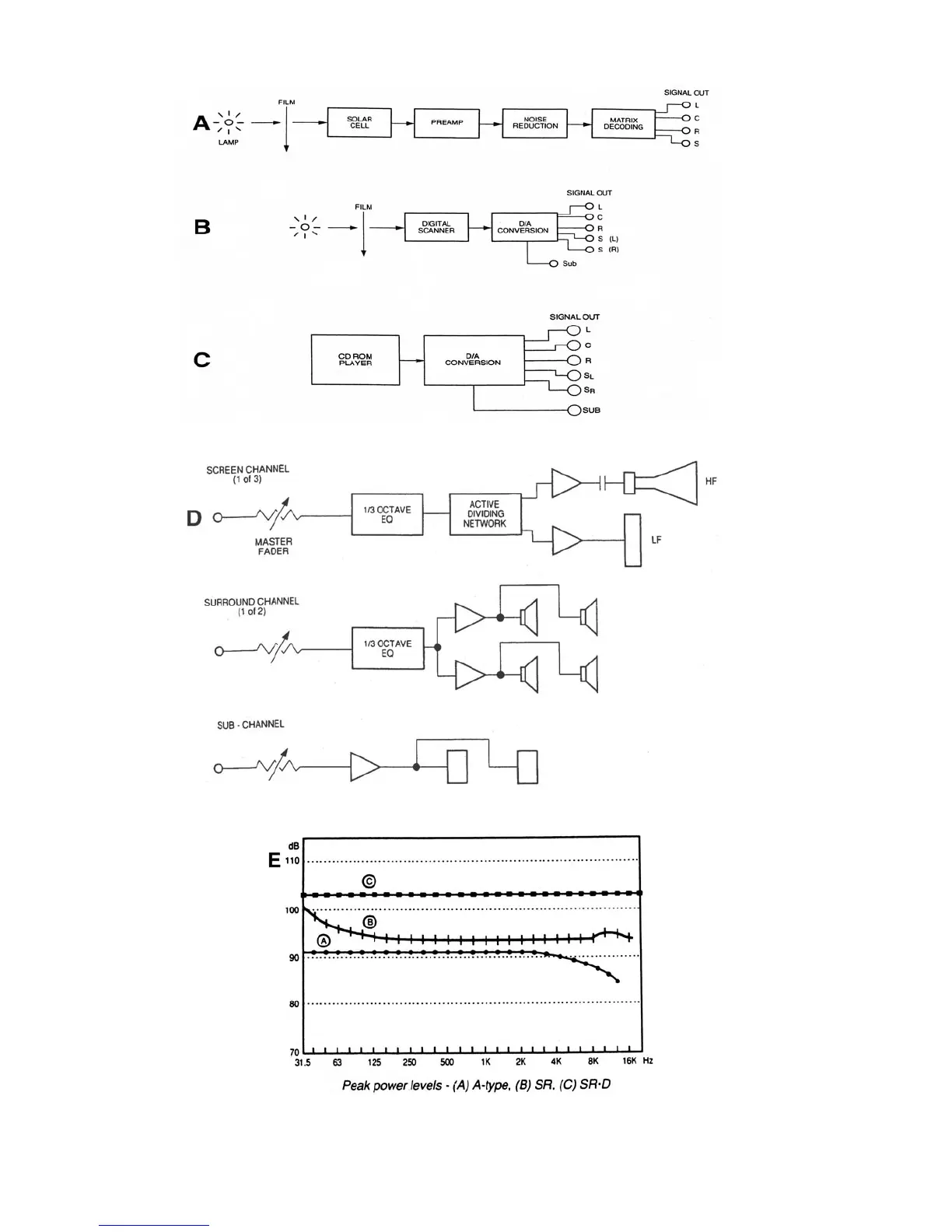 Figure 4: Analog A-chain (A); Digital A-chain, Dolby SR-D (B); Digital B-chain, DTS (C);