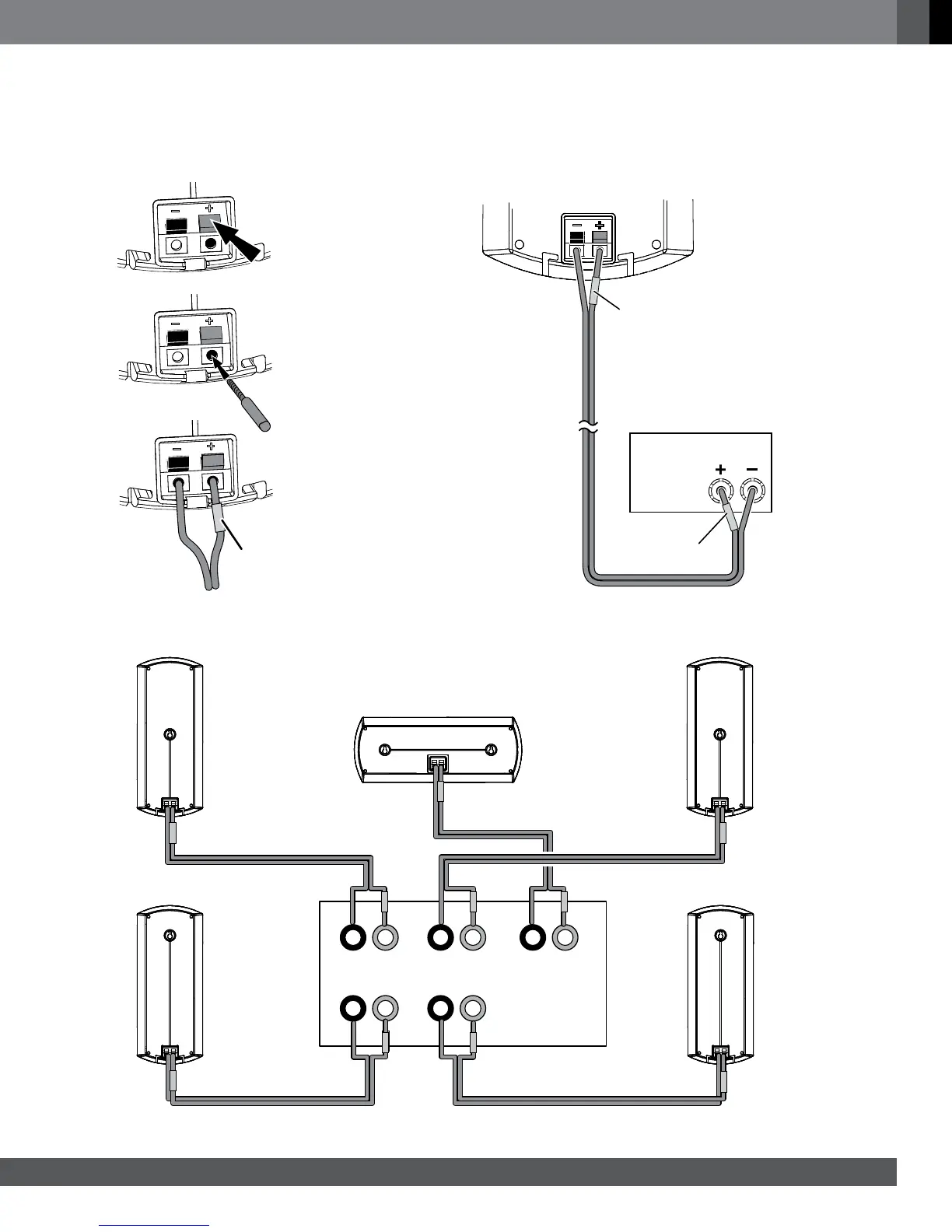 CAUTION: Before making speaker connections, be sure that your receiver or amplifier is turned off and preferably that its AC cord is