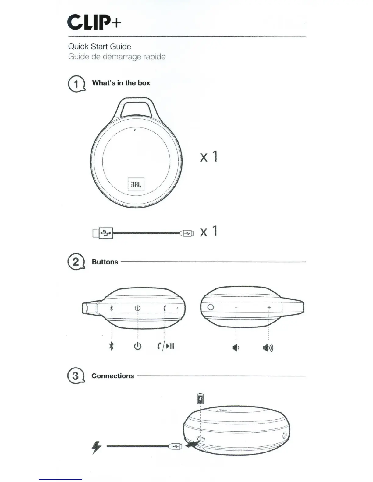 JBL CLIP+ - Quick Start Guide; Whats in the box; Buttons; Connections