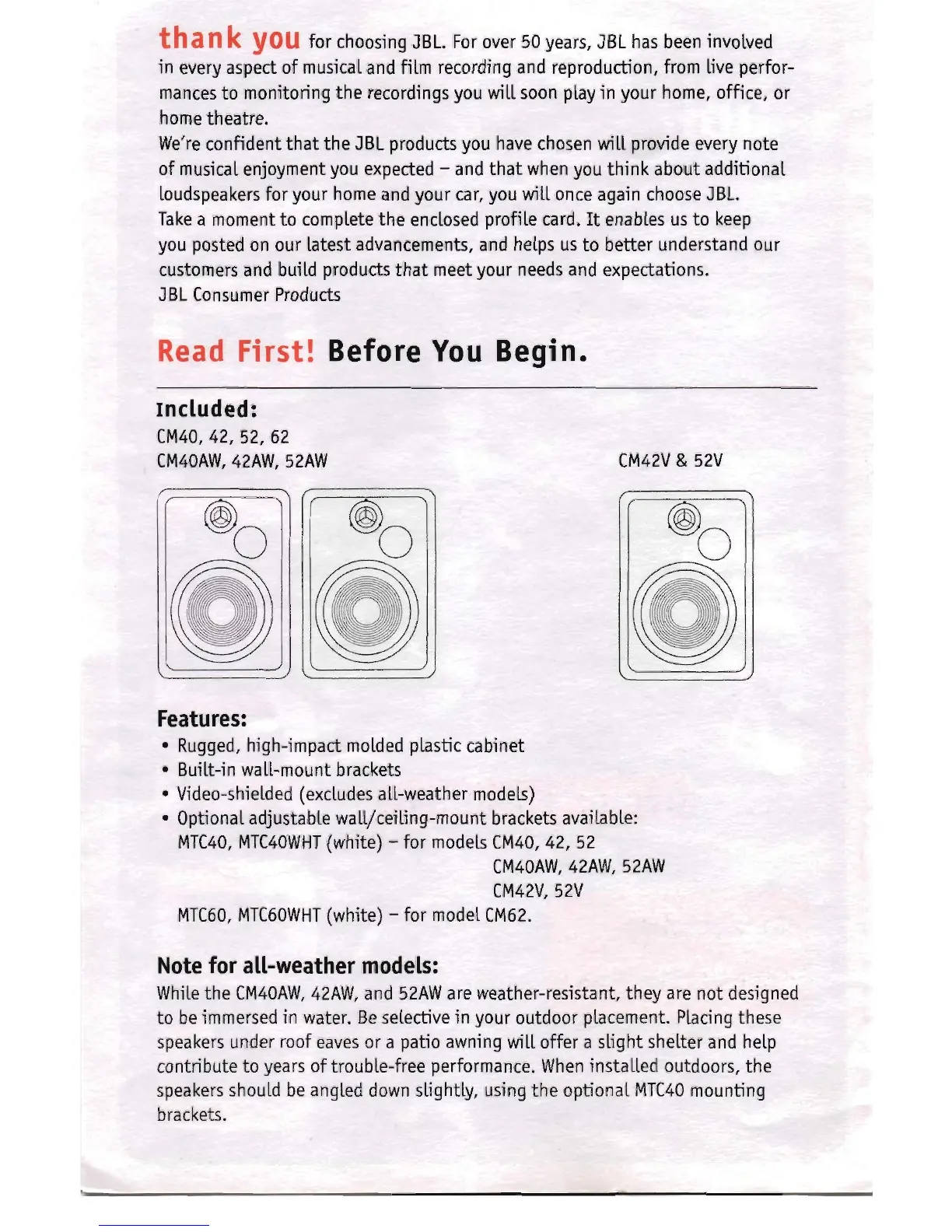 JBL CM40 - Read First! Before You Begin; Included; Features; Note for all-weather models