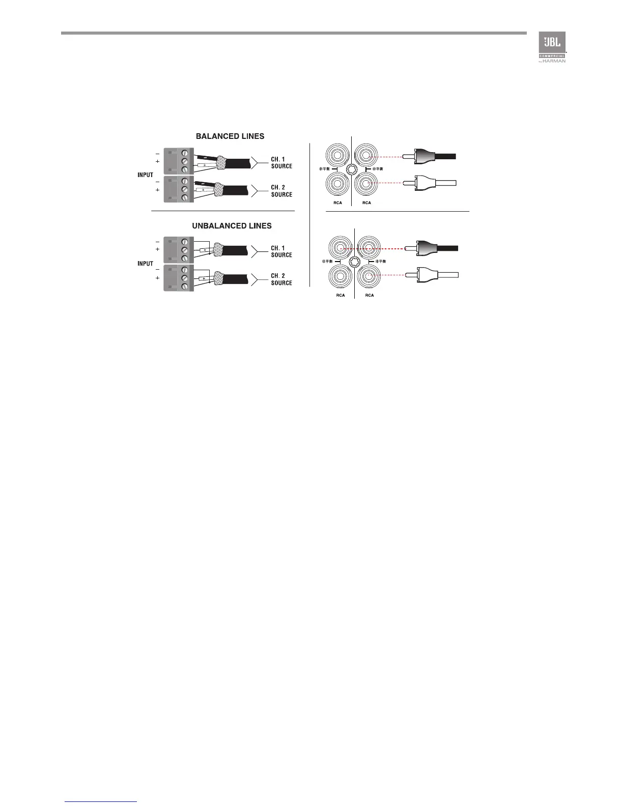 shield) 22-24 gauge cables to connect the amplifier balanced input by using shipped two