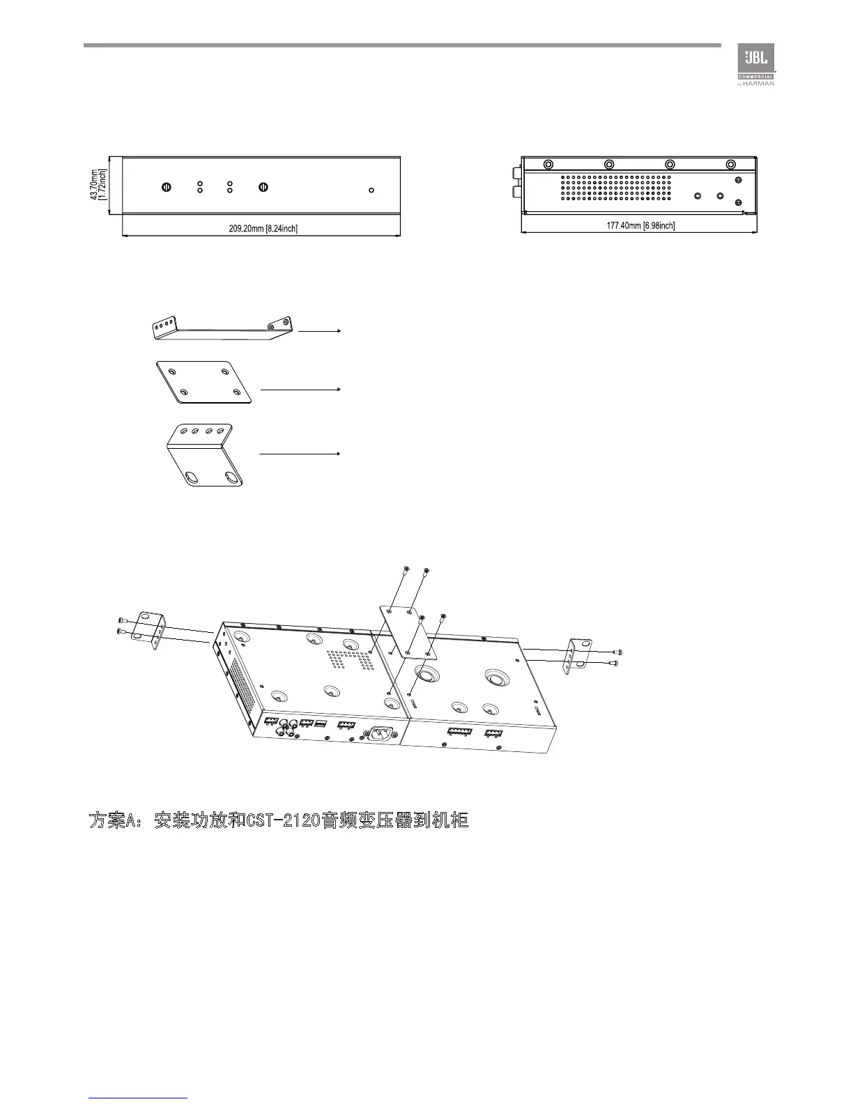 在您的机柜系统里安装功放和CST-2120音频变压器时,请参照图2.2.3完成如下操作: